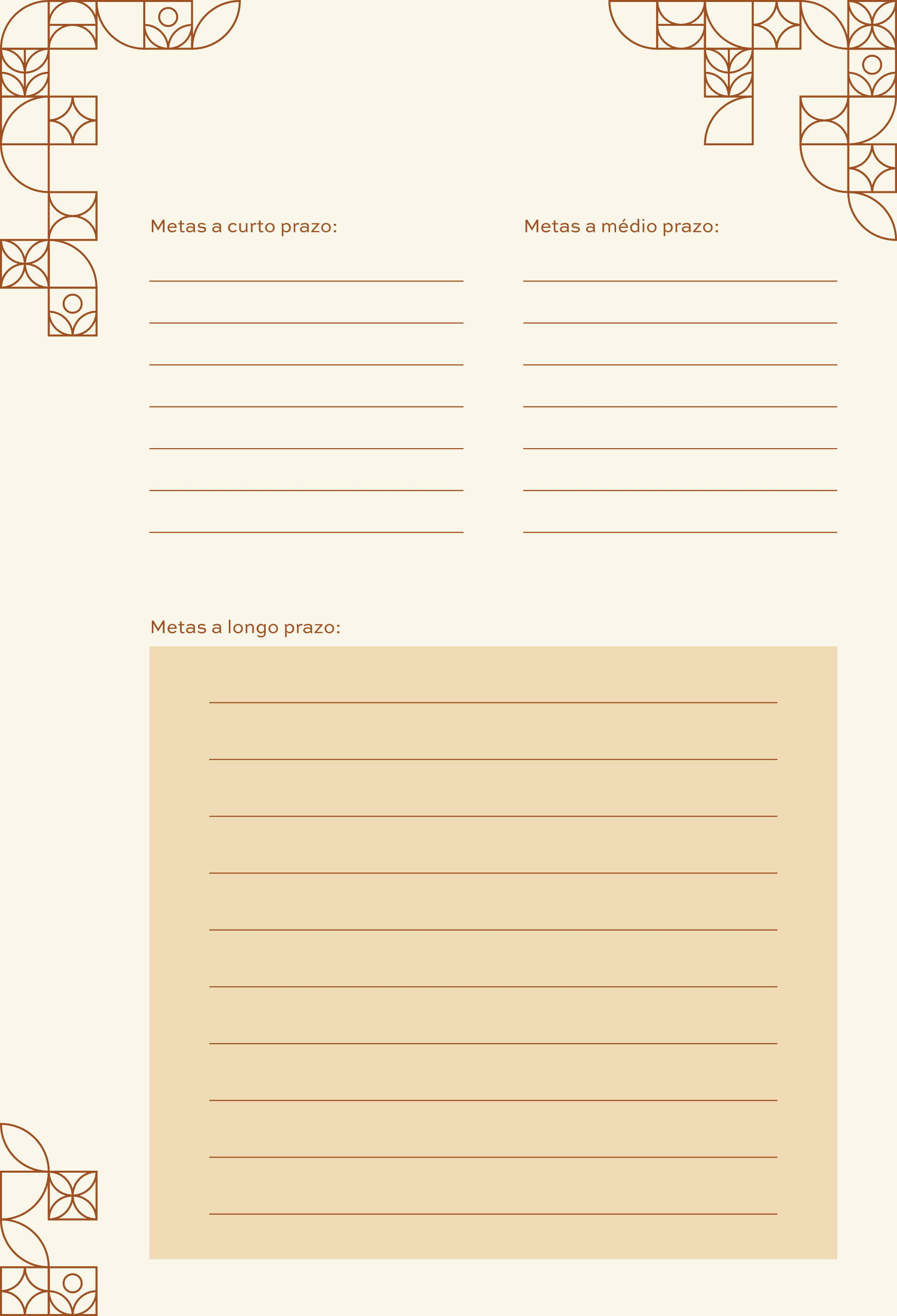 Espaços para metas, reflexões e planejamento diário e mensal